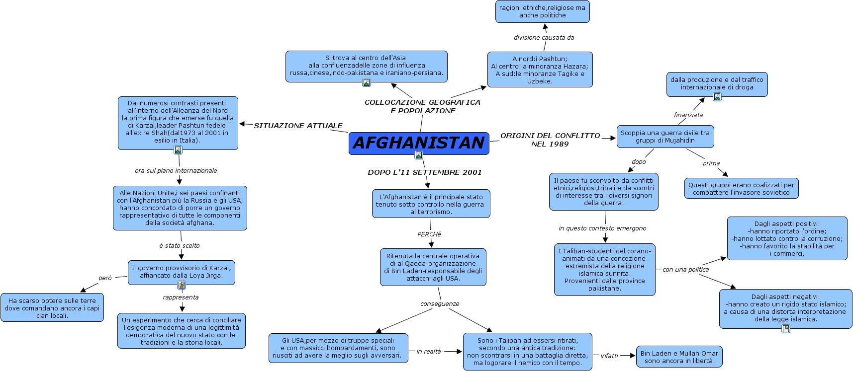 AFGHANISTAN, Ritenuta la centrale operativa di al Qaeda-organizzazione di Bin Laden-responsabile degli attacchi agli USA. conseguenze Gli USA,per mezzo di truppe speciali e con massicci bombardamenti, sono riusciti ad avere la meglio sugli avversari., Il governo provvisorio di Karzai, affiancato dalla Loya Jirga. rappresenta Un esperimento che cerca di conciliare l'esigenza moderna di una legittimità democratica del nuovo stato con le tradizioni e la storia locali., Sono i Taliban ad essersi ritirati, secondo una antica tradizione: non scontrarsi in una battaglia diretta, ma logorare il nemico con il tempo. infatti Bin Laden e Mullah Omar sono ancora in libertà., AFGHANISTAN SITUAZIONE ATTUALE Dai numerosi contrasti presenti all'interno dell'Alleanza del Nord la prima figura che emerse fu quella di Karzai,leader Pashtun fedele all'ex re Shah(dal1973 al 2001 in esilio in Italia)., Scoppia una guerra civile tra gruppi di Mujahidin dopo Il paese fu sconvolto da conflitti etnici,religiosi,tribali e da scontri di interesse tra i diversi signori della guerra., Ritenuta la centrale operativa di al Qaeda-organizzazione di Bin Laden-responsabile degli attacchi agli USA. conseguenze Sono i Taliban ad essersi ritirati, secondo una antica tradizione: non scontrarsi in una battaglia diretta, ma logorare il nemico con il tempo., I Taliban-studenti del corano- animati da una concezione estremista della religione islamica sunnita. Provenienti dalle province pakistane. con una politica Dagli aspetti negativi: -hanno creato un rigido stato islamico; a causa di una distorta interpretazione della legge islamica., Scoppia una guerra civile tra gruppi di Mujahidin finanziata dalla produzione e dal traffico internazionale di droga, AFGHANISTAN ORIGINI DEL CONFLITTO NEL 1989 Scoppia una guerra civile tra gruppi di Mujahidin, Il governo provvisorio di Karzai, affiancato dalla Loya Jirga. però Ha scarso potere sulle terre dove comandano ancora i capi clan locali.