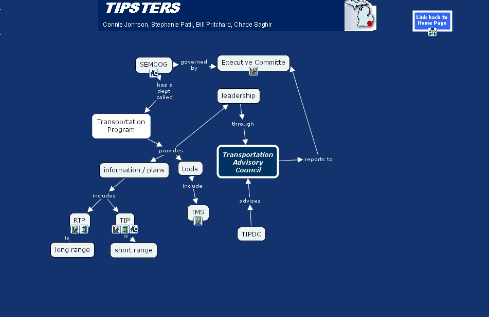 SEMCOG_Travel, Transportation Advisory Council reports to Executive Committe, information / plans includes RTP, Transportation Program provides tools, Transportation Program provides information / plans, tools include TMS, TIPDC advises Transportation Advisory Council, TIP is short range, SEMCOG governed by Executive Committe, RTP is long range, information / plans includes TIP