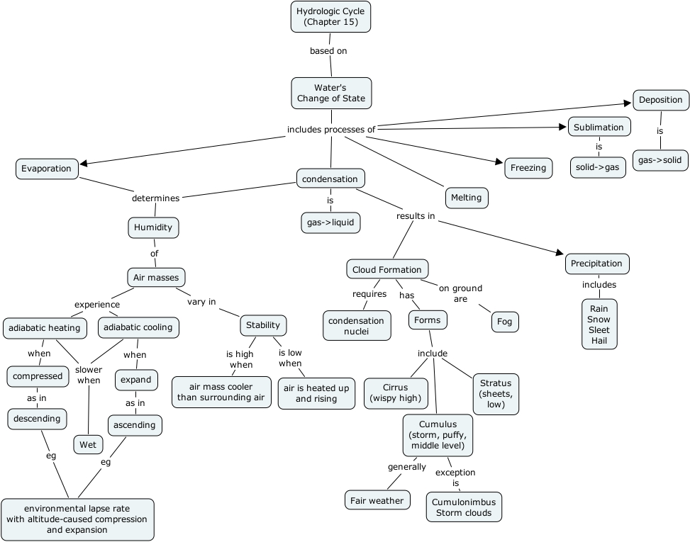 Meteorology Hydrologic Cycle Chapter 15, Water's Change of State includes processes of Deposition, Cloud Formation requires condensation nuclei, adiabatic cooling when expand, Sublimation is solid->gas, Cloud Formation on ground are Fog, Air masses experience adiabatic cooling, adiabatic cooling slower when Wet, Stability is low when air is heated up and rising, Cumulus (storm, puffy, middle level) generally Fair weather, condensation is gas->liquid