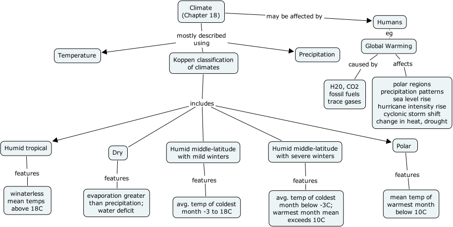 Meteorology Climate, Koppen classification of climates includes Dry, Koppen classification of climates includes Humid tropical, Humid middle-latitude with mild winters features avg. temp of coldest month -3 to 18C, Global Warming affects polar regions precipitation patterns sea level rise hurricane intensity rise cyclonic storm shift change in heat, drought, Climate (Chapter 18) may be affected by Humans, Polar features mean temp of warmest month below 10C, Humid middle-latitude with severe winters features avg. temp of coldest month below -3C; warmest month mean exceeds 10C, Dry features evaporation greater than precipitation; water deficit, Climate (Chapter 18) mostly described using Precipitation, Climate (Chapter 18) mostly described using Koppen classification of climates