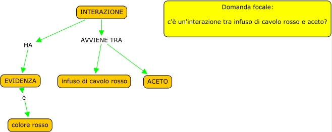 interazione cavolo rosso e aceto, INTERAZIONE AVVIENE TRA infuso di cavolo rosso, INTERAZIONE HA EVIDENZA, INTERAZIONE AVVIENE TRA ACETO, EVIDENZA è colore rosso