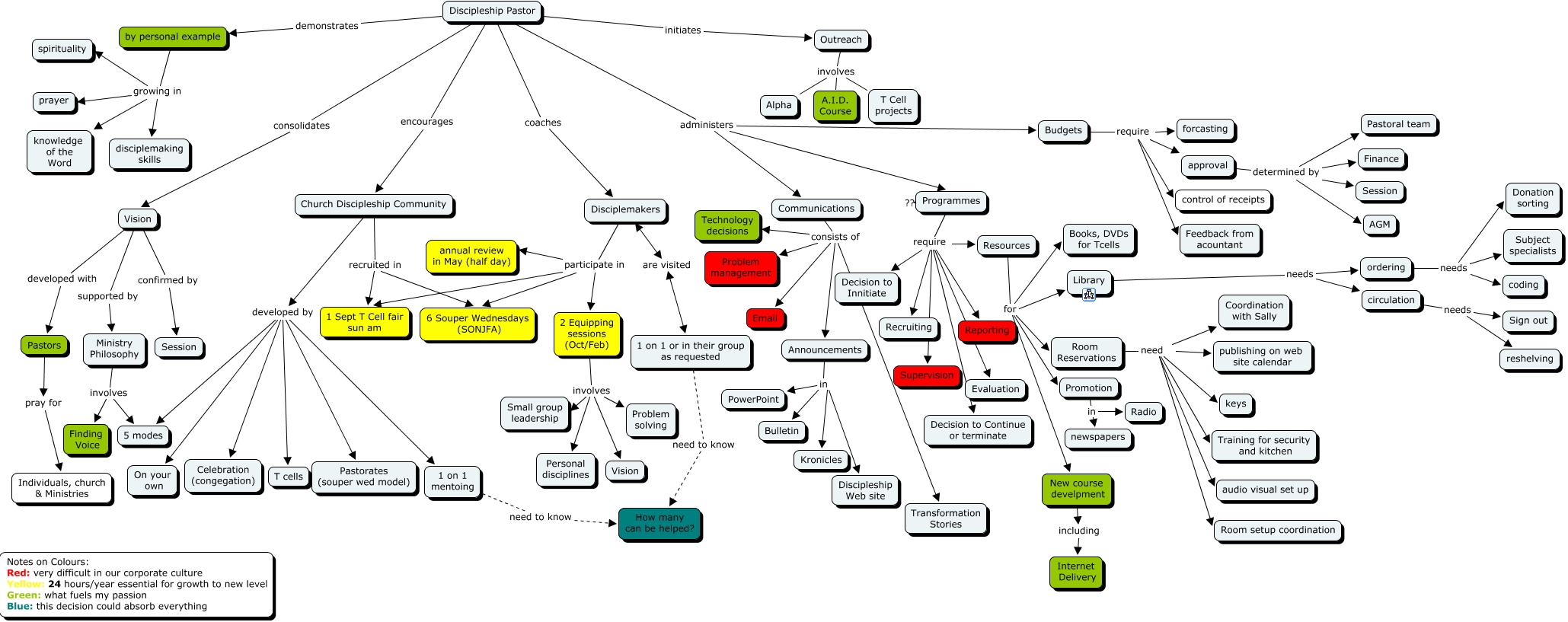 discipleship JD, by personal example growing in disciplemaking skills, Communications consists of Transformation Stories, Outreach involves T Cell projects, Discipleship Pastor demonstrates by personal example, Resources for Library, Vision confirmed by Session, Room Reservations need Coordination with Sally, Resources for New course develpment, Discipleship Pastor consolidates Vision, Disciplemakers participate in 2 Equipping sessions (Oct/Feb)