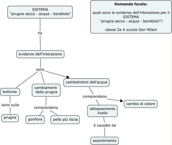 sist_prugnaacqua_RIVOLI, cambiamenti dell'acqua comprendono cambio di colore, bollicine sono sulla prugna, evidenze dell'interazione sono cambiamenti della prugna, SISTEMA "prugna secca - acqua - barattolo" ha evidenze dell'interazione, cambiamenti della prugna comprendono gonfiore, evidenze dell'interazione sono bollicine, cambiamenti dell'acqua comprendono abbassamento livello, evidenze dell'interazione sono cambiamenti dell'acqua, abbassamento livello è causato da assorbimento, cambiamenti della prugna comprendono pelle più liscia