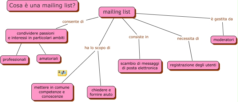 mailing list, mailing list ha lo scopo di mettere in comune competenze e conoscenze, mailing list ha lo scopo di chiedere e fornire aiuto, mailing list necessita di registrazione degli utenti, condividere passioni e interessi in particolari ambiti ???? amatoriali, mailing list consente di condividere passioni e interessi in particolari ambiti, mailing list consiste in scambio di messaggi di posta elettronica, mailing list è gestita da moderatori, condividere passioni e interessi in particolari ambiti ???? professionali