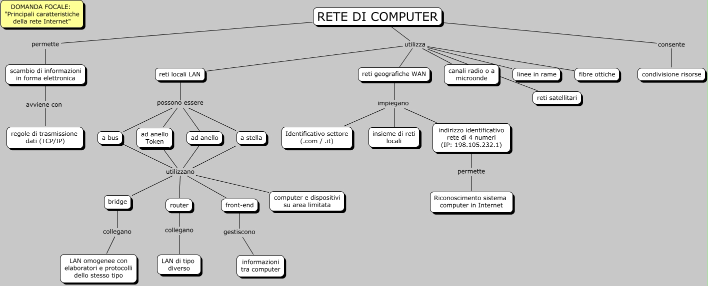 Rete di computer, reti locali LAN possono essere ad anello Token, reti locali LAN possono essere a stella, RETE DI COMPUTER utilizza reti locali LAN, router collegano LAN di tipo diverso, ad anello utilizzano router, RETE DI COMPUTER utilizza reti satellitari, reti geografiche WAN impiegano insieme di reti locali, scambio di informazioni in forma elettronica avviene con regole di trasmissione dati (TCP/IP), ad anello Token utilizzano bridge, ad anello utilizzano front-end