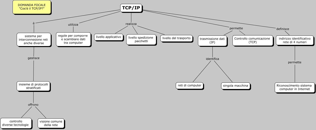 Questa Mappa Concettuale ha informazioni correlate a: TCP-IP, trasmissione dati (IP) identifica reti di computer, TCP/IP permette trasmissione dati (IP), sistema per interconnesione reti anche diverse gestisce insieme di protocolli stratificati, TCP/IP è sistema per interconnesione reti anche diverse, TCP/IP permette Controllo comunicazione (TCP), TCP/IP realizza livello applicativo, insieme di protocolli stratificati offrono controllo diverse tecnologie, indirizzo identificativo rete di 4 numeri permette Riconoscimento sistema computer in Internet, TCP/IP realizza livello spedizione pacchetti, TCP/IP utilizza regole per comporre e scambiare dati tra computer, TCP/IP definisce indirizzo identificativo rete di 4 numeri, TCP/IP realizza livello del trasporto, insieme di protocolli stratificati offrono visione comune della rete, trasmissione dati (IP) identifica singola macchina