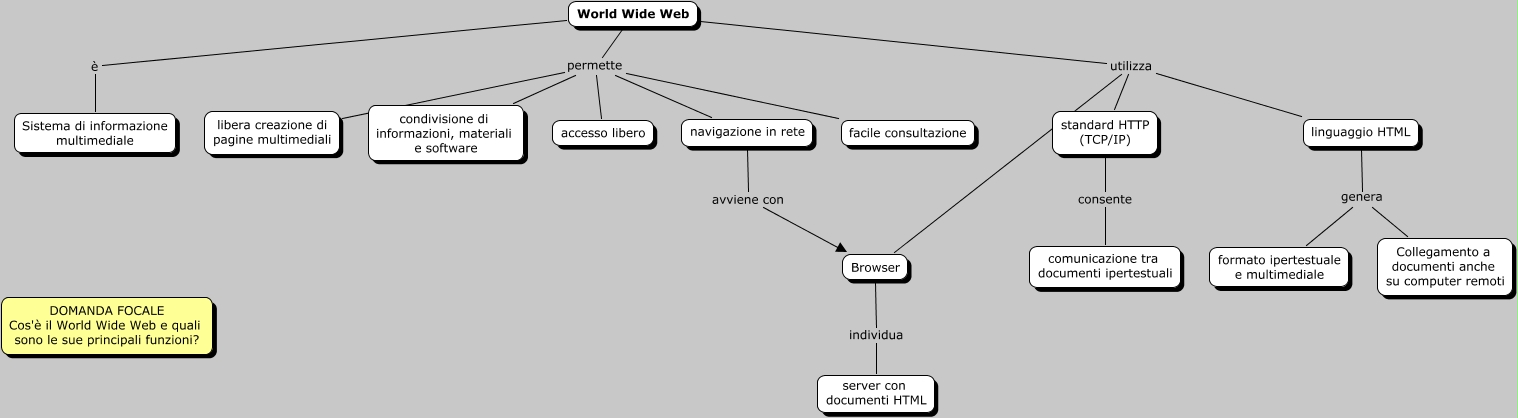 World Wide Web, standard HTTP (TCP/IP) consente comunicazione tra documenti ipertestuali, World Wide Web utilizza standard HTTP (TCP/IP), World Wide Web permette navigazione in rete, World Wide Web permette accesso libero, World Wide Web permette facile consultazione, Browser individua server con documenti HTML, World Wide Web permette condivisione di informazioni, materiali e software, linguaggio HTML genera formato ipertestuale e multimediale, World Wide Web è Sistema di informazione multimediale, World Wide Web permette libera creazione di pagine multimediali