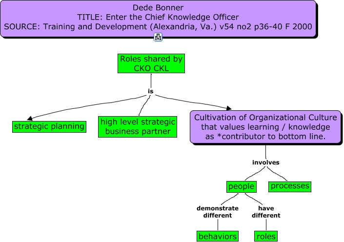 Bonner_EnterCKO_Role, people have different roles, Cultivation of Organizational Culture that values learning / knowledge as *contributor to bottom line. involves processes, Cultivation of Organizational Culture that values learning / knowledge as *contributor to bottom line. involves people, people demonstrate different behaviors, Roles shared by CKO CKL is high level strategic business partner, Roles shared by CKO CKL is Cultivation of Organizational Culture that values learning / knowledge as *contributor to bottom line., Roles shared by CKO CKL is strategic planning