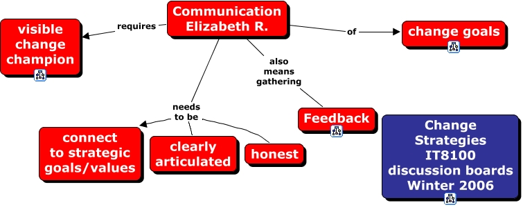 ChangeCommunication, Communication Elizabeth R. needs to be clearly articulated, Communication Elizabeth R. needs to be connect to strategic goals/values, Communication Elizabeth R. requires visible change champion, Communication Elizabeth R. needs to be honest, Communication Elizabeth R. of change goals, Communication Elizabeth R. also means gathering Feedback