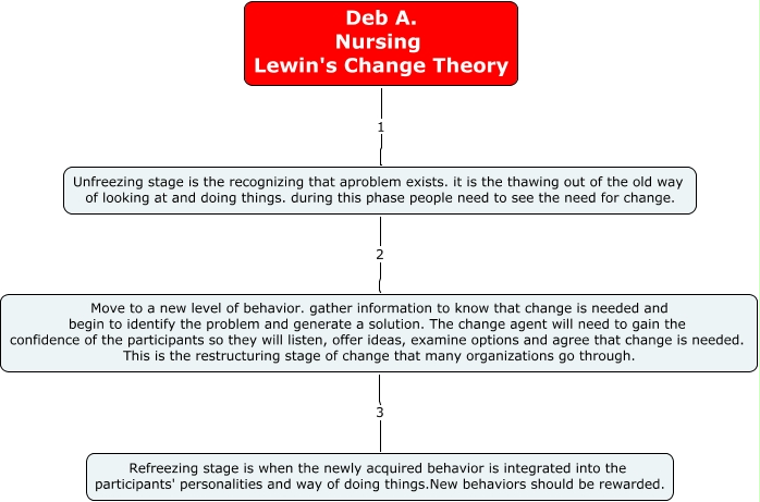 NursingChangTheory, Unfreezing stage is the recognizing that aproblem exists. it is the thawing out of the old way of looking at and doing things. during this phase people need to see the need for change. 2 Move to a new level of behavior. gather information to know that change is needed and begin to identify the problem and generate a solution. The change agent will need to gain the confidence of the participants so they will listen, offer ideas, examine options and agree that change is needed. This is the restructuring stage of change that many organizations go through., Deb A. Nursing Lewin's Change Theory 1 Unfreezing stage is the recognizing that aproblem exists. it is the thawing out of the old way of looking at and doing things. during this phase people need to see the need for change., Move to a new level of behavior. gather information to know that change is needed and begin to identify the problem and generate a solution. The change agent will need to gain the confidence of the participants so they will listen, offer ideas, examine options and agree that change is needed. This is the restructuring stage of change that many organizations go through. 3 Refreezing stage is when the newly acquired behavior is integrated into the participants' personalities and way of doing things.New behaviors should be rewarded.