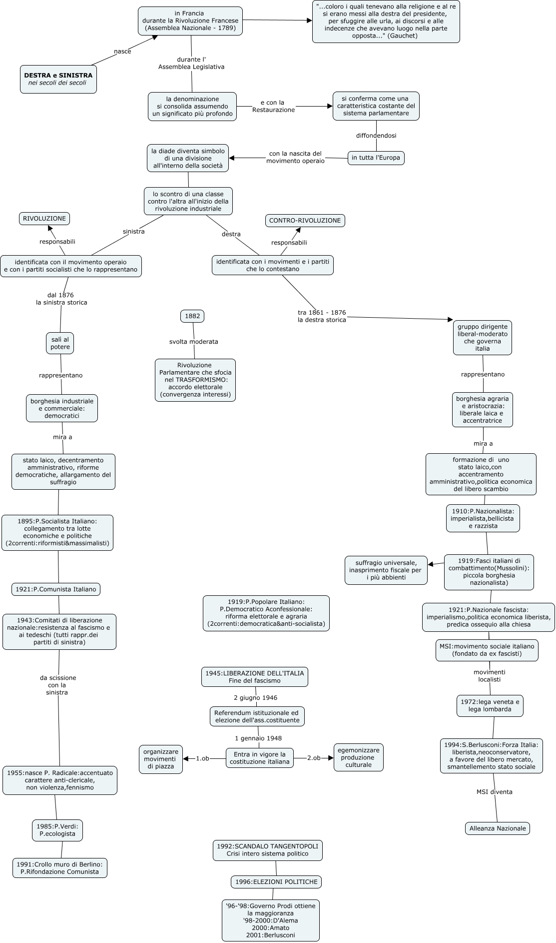 Questa Cmap, creata con IHMC CmapTools, contiene informazioni relative a: D-S - CRONOLOGIA (Visco + Giu), 1994:S.Berlusconi:Forza Italia: liberista,neoconservatore, a favore del libero mercato, smantellemento stato sociale MSI diventa Alleanza Nazionale, Entra in vigore la costituzione italiana 1.ob organizzare movimenti di piazza, 1919:Fasci italiani di combattimento(Mussolini): piccola borghesia nazionalista) ???? suffragio universale, inasprimento fiscale per i più abbienti, 1882 svolta moderata Rivoluzione Parlamentare che sfocia nel TRASFORMISMO: accordo elettorale (convergenza interessi), identificata con il movimento operaio e con i partiti socialisti che lo rappresentano responsabili RIVOLUZIONE, 1955:nasce P. Radicale:accentuato carattere anti-clericale, non violenza,fennismo ???? 1985:P.Verdi: P.ecologista, in Francia durante la Rivoluzione Francese (Assemblea Nazionale - 1789) durante l' Assemblea Legislativa la denominazione si consolida assumendo un significato più profondo, gruppo dirigente liberal-moderato che governa italia rappresentano borghesia agraria e aristocrazia: liberale laica e accentratrice, borghesia industriale e commerciale: democratici mira a stato laico, decentramento amministrativo, riforme democratiche, allargamento del suffragio, lo scontro di una classe contro l'altra all'inizio della rivoluzione industriale destra identificata con i movimenti e i partiti che lo contestano, 1921:P.Nazionale fascista: imperialismo,politica economica liberista, predica ossequio alla chiesa movimenti localisti 1972:lega veneta e lega lombarda, 1996:ELEZIONI POLITICHE ???? '96-'98:Governo Prodi ottiene la maggioranza '98-2000:D'Alema 2000:Amato 2001:Berlusconi, la denominazione si consolida assumendo un significato più profondo e con la Restaurazione si conferma come una caratteristica costante del sistema parlamentare, borghesia agraria e aristocrazia: liberale laica e accentratrice mira a formazione di uno stato laico,con accentramento amministrativo,politica economica del libero scambio, lo scontro di una classe contro l'altra all'inizio della rivoluzione industriale sinistra identificata con il movimento operaio e con i partiti socialisti che lo rappresentano, identificata con i movimenti e i partiti che lo contestano tra 1861 - 1876 la destra storica gruppo dirigente liberal-moderato che governa italia, 1992:SCANDALO TANGENTOPOLI Crisi intero sistema politico ???? 1996:ELEZIONI POLITICHE, stato laico, decentramento amministrativo, riforme democratiche, allargamento del suffragio ???? 1895:P.Socialista Italiano: collegamento tra lotte economiche e politiche (2correnti:riformisti&massimalisti), 1921:P.Nazionale fascista: imperialismo,politica economica liberista, predica ossequio alla chiesa movimenti localisti 1972:lega veneta e lega lombarda, la diade diventa simbolo di una divisione all'interno della società ???? lo scontro di una classe contro l'altra all'inizio della rivoluzione industriale