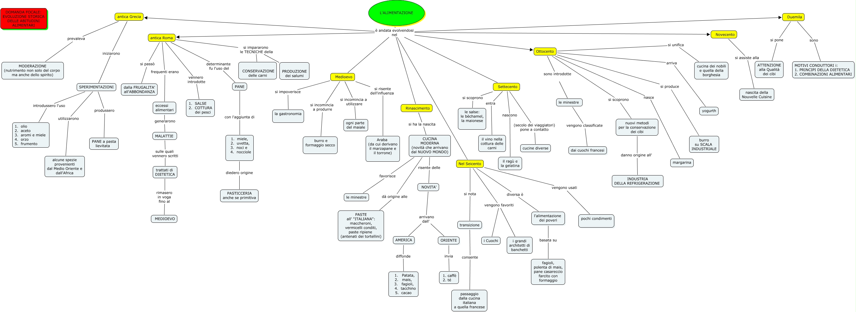 Storia dell'alimentazione revisionata, L'ALIMENTAZIONE è andata evolvendosi nel Duemila, L'ALIMENTAZIONE è andata evolvendosi nel Nel Seicento, L'ALIMENTAZIONE è andata evolvendosi nel antica Roma, Nel Seicento vengono usati pochi condimenti, PANE con l'aggiunta di 1. miele, 2. uvetta, 3. noci e 4. nocciole, Ottocento si unifica cucina dei nobili e quella della borghesia, Duemila si pone ATTENZIONE alla Qualità dei cibi, Settecento (secolo dei viaggiatori) pone a contatto cucine diverse, antica Roma si impararono le TECNICHE della CONSERVAZIONE delle carni, ORIENTE invia 1. caffè 2. té