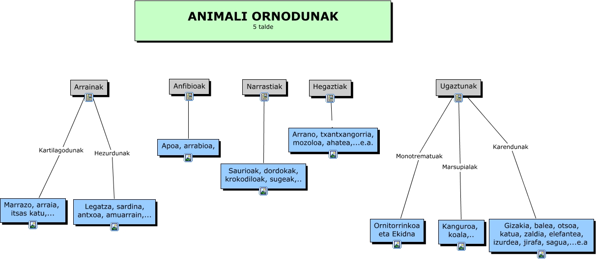 Animali Ornodunak, Arrainak Kartilagodunak Marrazo, arraia, itsas katu,..., Arrainak Hezurdunak Legatza, sardina, antxoa, amuarrain,..., Anfibioak ???? Apoa, arrabioa,, Narrastiak ???? Saurioak, dordokak, krokodiloak, sugeak,.., Ugaztunak Marsupialak Kanguroa, koala,.., Ugaztunak Karendunak Gizakia, balea, otsoa, katua, zaldia, elefantea, izurdea, jirafa, sagua,...e.a, Hegaztiak Arrano, txantxangorria, mozoloa, ahatea,...e.a., Ugaztunak Monotrematuak Ornitorrinkoa eta Ekidna