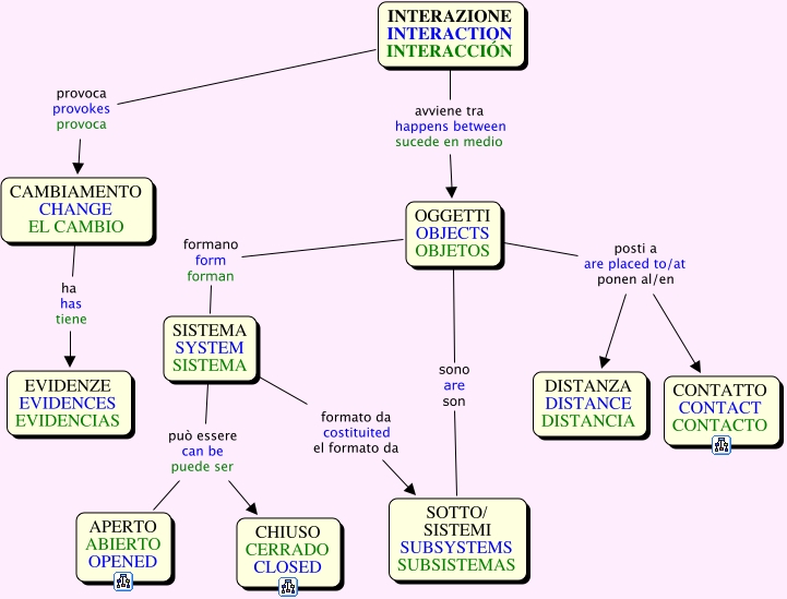sistema, CAMBIAMENTO CHANGE EL CAMBIO ha has tiene EVIDENZE EVIDENCES EVIDENCIAS, OGGETTI OBJECTS OBJETOS posti a are placed to/at ponen al/en CONTATTO CONTACT CONTACTO, SISTEMA SYSTEM SISTEMA formato da costituited el formato da SOTTO/ SISTEMI SUBSYSTEMS SUBSISTEMAS, SISTEMA SYSTEM SISTEMA può essere can be puede ser APERTO ABIERTO OPENED, INTERAZIONE INTERACTION INTERACCIÓN avviene tra happens between sucede en medio OGGETTI OBJECTS OBJETOS, OGGETTI OBJECTS OBJETOS sono are son SOTTO/ SISTEMI SUBSYSTEMS SUBSISTEMAS, OGGETTI OBJECTS OBJETOS formano form forman SISTEMA SYSTEM SISTEMA, OGGETTI OBJECTS OBJETOS posti a are placed to/at ponen al/en DISTANZA DISTANCE DISTANCIA, INTERAZIONE INTERACTION INTERACCIÓN provoca provokes provoca CAMBIAMENTO CHANGE EL CAMBIO, SISTEMA SYSTEM SISTEMA può essere can be puede ser CHIUSO CERRADO CLOSED
