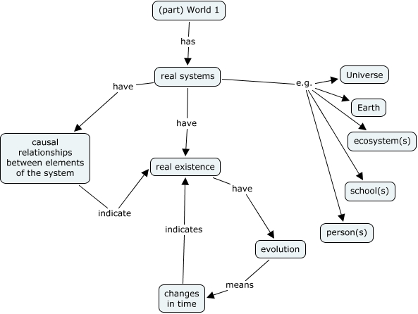 real systems, real systems e.g. Earth, real systems e.g. person(s), real systems e.g. school(s), real systems e.g. Universe, real systems e.g. ecosystem(s), changes in time indicates real existence, causal relationships between elements of the system indicate real existence, (part) World 1 has real systems, real existence have evolution, real systems have real existence
