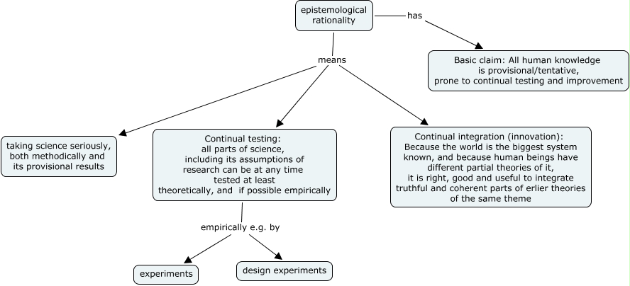 epistemological rationality, epistemological rationality means Continual integration (innovation): Because the world is the biggest system known, and because human beings have different partial theories of it, it is right, good and useful to integrate truthful and coherent parts of erlier theories of the same theme, epistemological rationality has Basic claim: All human knowledge is provisional/tentative, prone to continual testing and improvement, epistemological rationality means taking science seriously, both methodically and its provisional results, Continual testing: all parts of science, including its assumptions of research can be at any time tested at least theoretically, and if possible empirically empirically e.g. by experiments, Continual testing: all parts of science, including its assumptions of research can be at any time tested at least theoretically, and if possible empirically empirically e.g. by design experiments, epistemological rationality means Continual testing: all parts of science, including its assumptions of research can be at any time tested at least theoretically, and if possible empirically