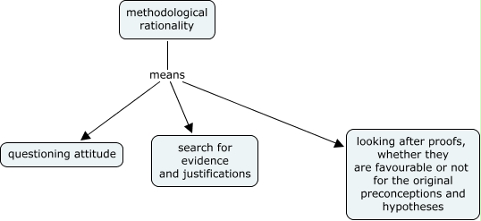 methodological rationality, methodological rationality means search for evidence and justifications, methodological rationality means questioning attitude, methodological rationality means looking after proofs, whether they are favourable or not for the original preconceptions and hypotheses