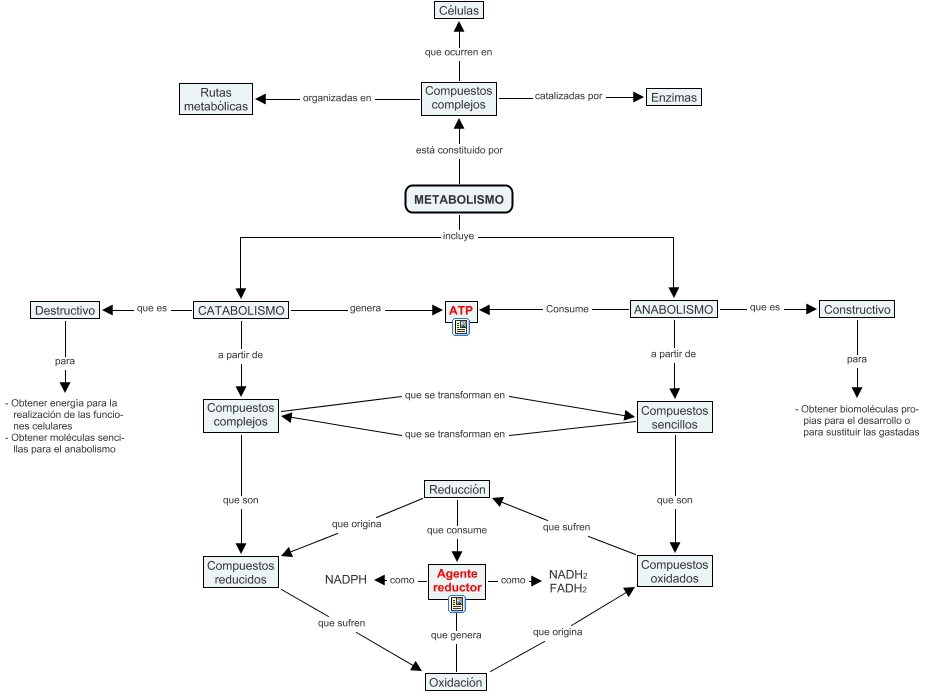 Metabolismo, Oxidación que origina Compuestos oxidados, ANABOLISMO a partir de Compuestos sencillos, ANABOLISMO Consume ATP, Constructivo para - Obtener biomoléculas pro- pias para el desarrollo o para sustituir las gastadas, METABOLISMO incluye ANABOLISMO, Agente reductor como NADPH, Compuestos sencillos que se transforman en Compuestos complejos, METABOLISMO incluye CATABOLISMO, Compuestos complejos que ocurren en Células, CATABOLISMO a partir de Compuestos complejos